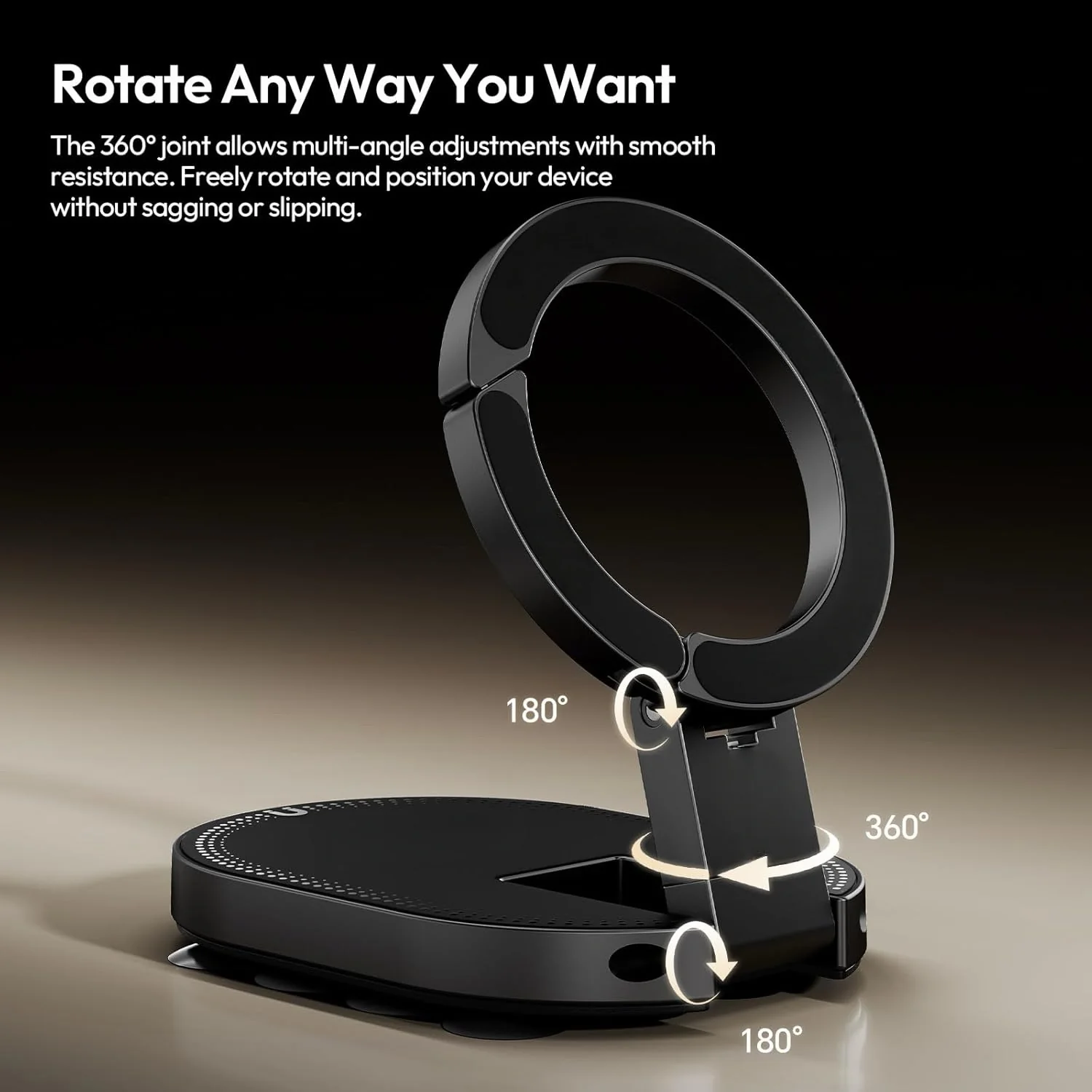 The foldable design also works as a desktop stand, while 360° rotation and 180° tilt make it easy to switch between portrait and landscape mode and adjust to the angle you need. A built-in carabiner clip adds grab-and-go convenience for bags, backpacks, and everyday carry.